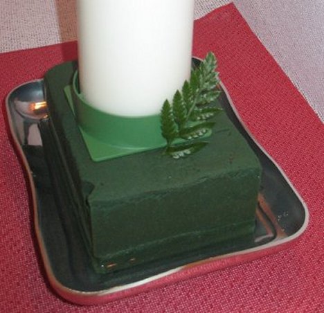 Note how I inserted the fern frond deep into the foam at a slight angle INWARDS towards the candle.