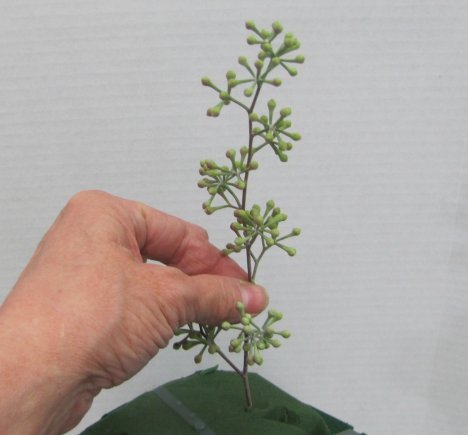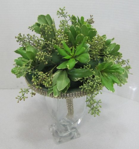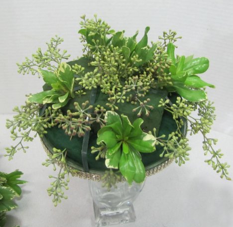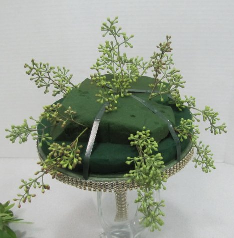 I start the greening process by placing the first stem in the center of the bouquet, standing straight up. You'll notice in this photo I was experimenting with adding more foam, yet ended up finding that it made the bouquet too heavy. Stick with the original if you're not sure, but don't be afraid to experiment. That's what makes a designer grow.