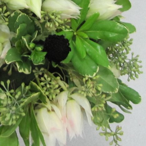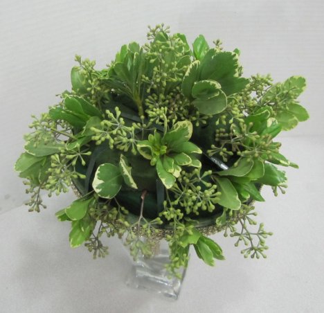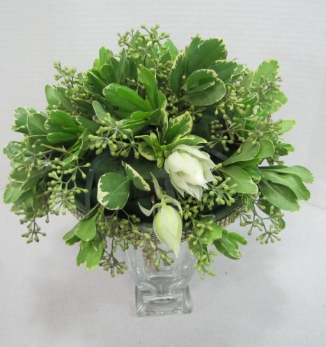 Variegated pittosporum is another unique green. It's waxy rounded leaves adds a nice contrast to the other elements in this design.