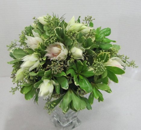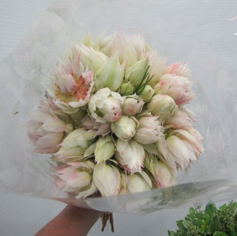 I fell in love with blushing bride protea from the first time I spotted it in my wholesaler's cooler. This lovely tropical comes in a creamy white and a mauve variety streaked with lines of blush pink.