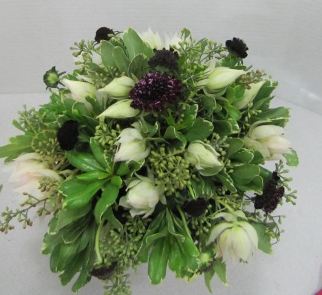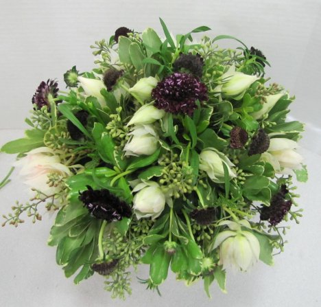 I love the unique look that the pale green seeds give when you're making wedding bouquets. They are a wonderful contrast to the deep rich burgundy of the scabiosa and the golden yellow of the roses that are later added to this design.