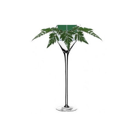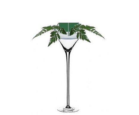 Tape across the top on both sides. Don't worry . . . if you drop your greenery down to cover the rim of your glass you should be able to conceal the waterproof tape. If you are using really tall vases, I suggest you do your greening and flowers separately in the silver dish, and then take that arrangement to the reception hall and then place them in the martini vase.