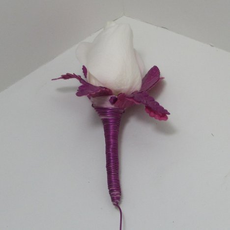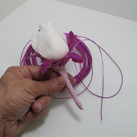 I'm using metallic wire to encircle the stem of this boutonniere. It compliments the shining accent of the holographic leaves.