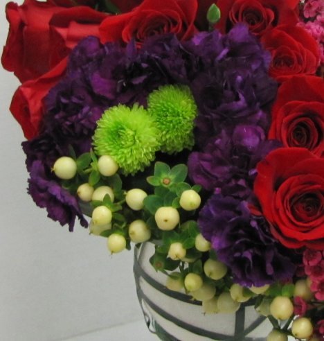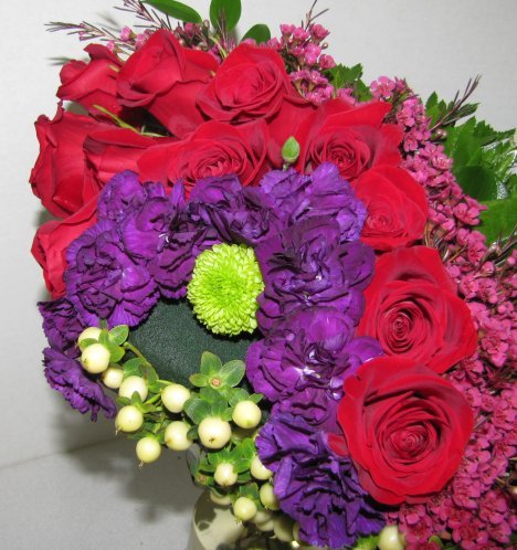 This mixed bouquet has different variety of greens, pink wax flower, red roses, purple miniature carnations and now bright green button mums.
