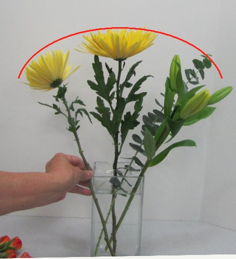 A side view shows the natural rounded curve I've trying to achieve with the flower arrangement.
