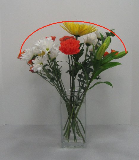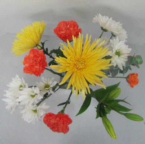 A side view gives it a good perspective of how the arrangement is building. Placing the orange spray roses on both sides gives balance.
