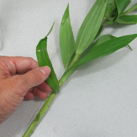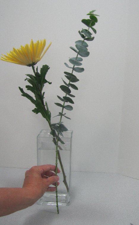 Remove the leaves from the bottom, leaving a few leaves at the top to fill out the vase in greenery.
