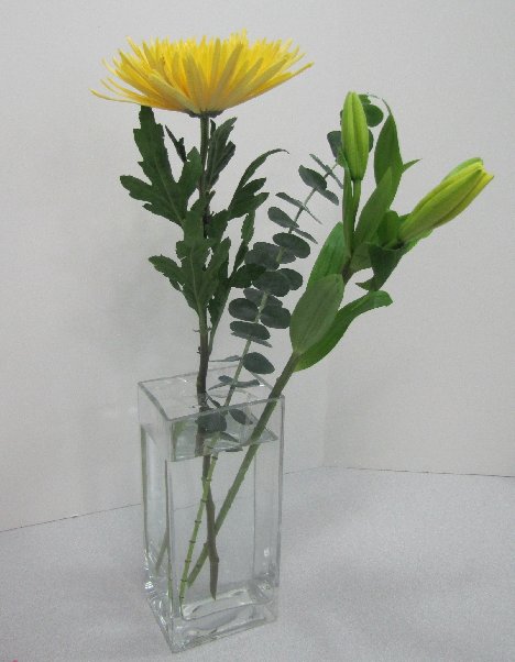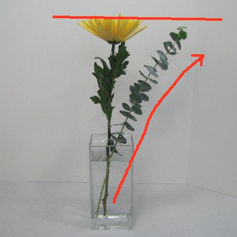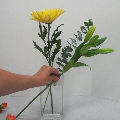 Use the natural lines and curves of the flowers to advantage. The flowers in the beginning are the same height, but the side flowers are leaned out at a 45 degree angle to the center focal flower.