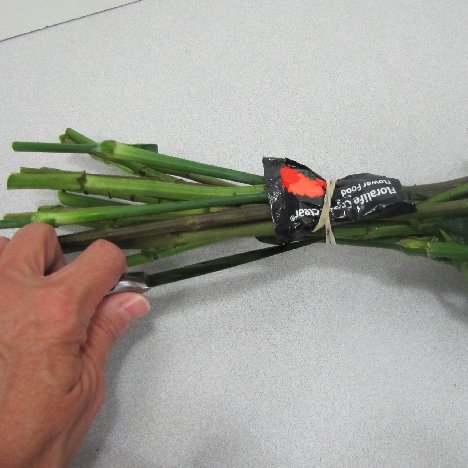 Cut carefully the rubber band attaching the packet to the stems. You don't want to damage the stems.