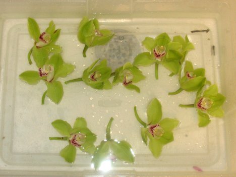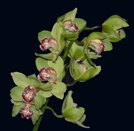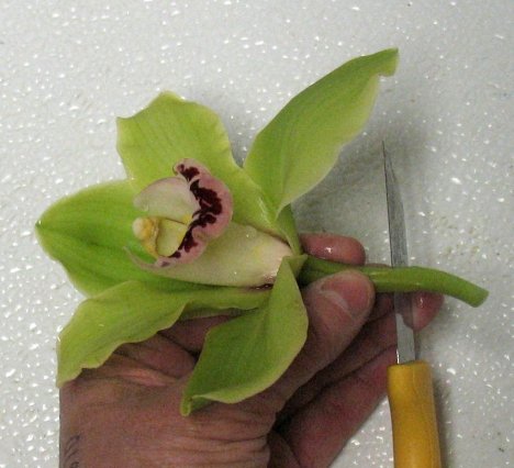 Cut each cymbidium bloom off individually where the laterals meet the regular stem of the entire flower.