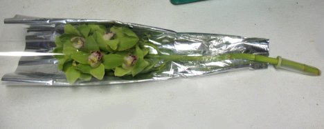 The cymbidiums arrive in a protective plastic sleeve with an attached water tube at the bottom of the cut stem.