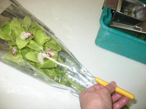 Be careful as you slit the plastic open not to damage any of the petals of the orchids.