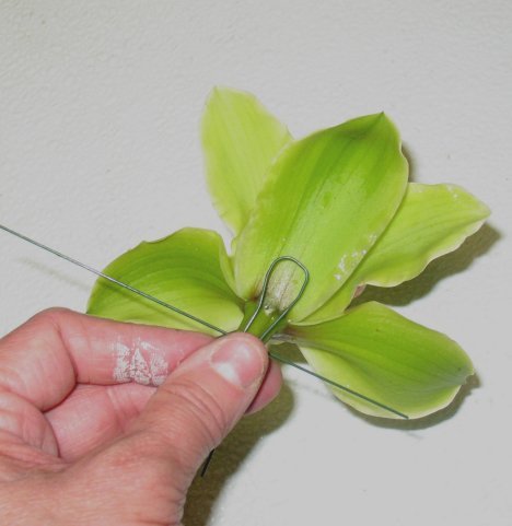 You may need to add extra support to the back of the flower heads like these orchids.  Simply bend a piece of florist wire into a hairpin shape.