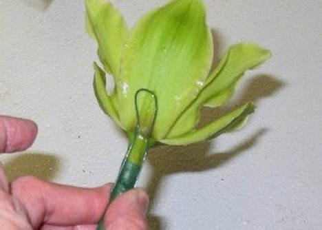 Press this shaped wire against the back of the flower, bending slightly backwards to follow the curve of the heavy petals.