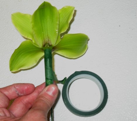 Here I taped down the stem after bending down the 26 gauge wire. I tape all down the stem, concealing the bare wire.