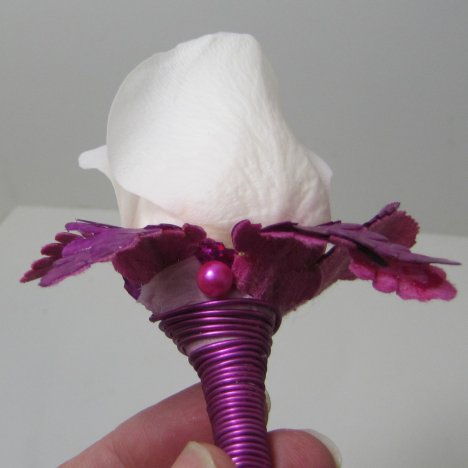 I'm going to insert it into the front of the boutonniere, pushing hard to insert the full length between the two bent over leaves.