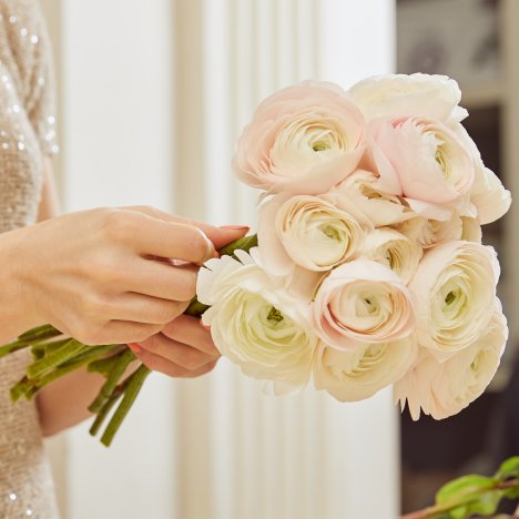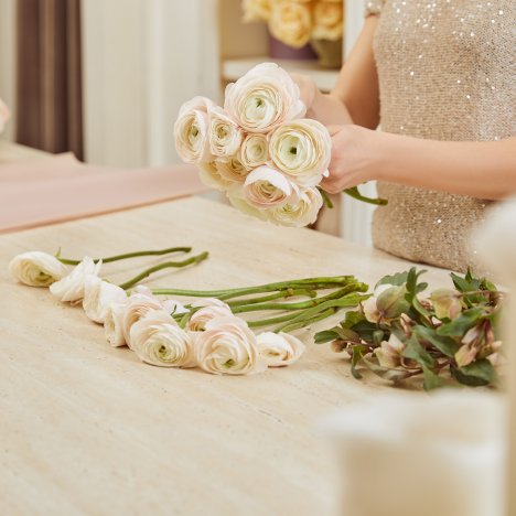 Continue to add more blooms to your peony wedding bouquet, turning the bouquet occasionally to keep the bouquet a round shape.