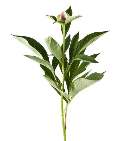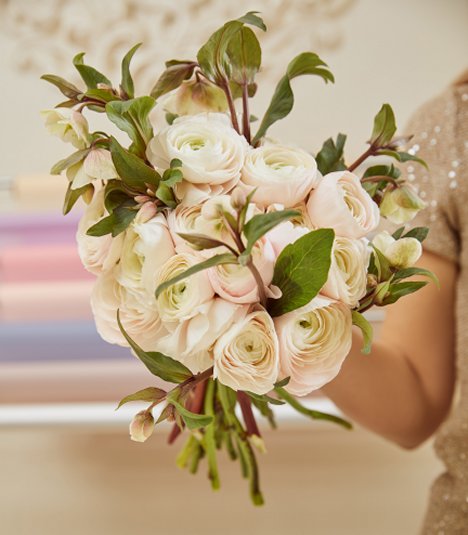 Once the round (leafless) peonies are in place, you can add some of the green leafy stems or buds to the outer perimeter of the bouquet.