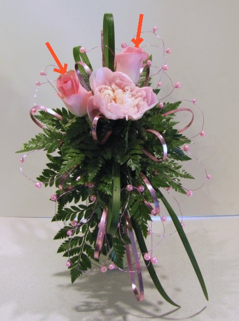 I inserted two pink standard roses, one right above the peony and another to the left and a little lower.