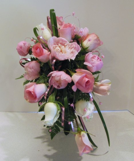 I added a few white roses for contrast. Although this bride loved pink, I wanted to give a little break to the eye. Keep in mind that monochromatic (all one color) bouquets should have different textures or elements to add more interest to the bouquet.