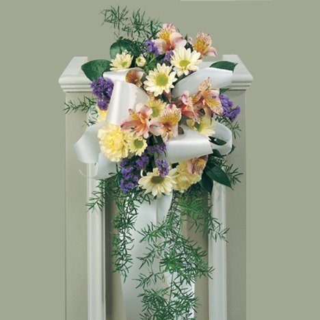 These pew flowers with a bow are a beautiful addition to a formal church wedding. This same design can be used as chuppah flowers or attached to wedding chairs. To create a similar design, you will need the following hard goods and fresh flowers: