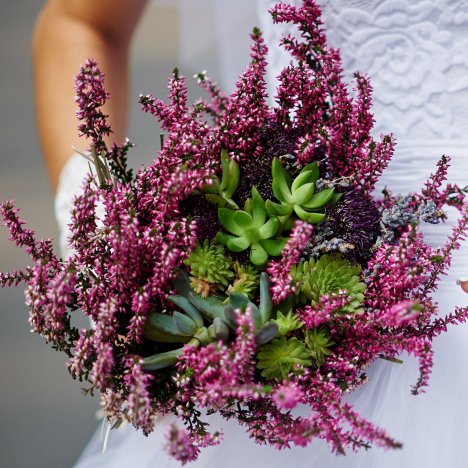 This pink and green wedding bouquet is a show stopper with a free style look combined with succulents as the flower blooms. This is a hand tied clutch, but you must take care to wire the succulents as they have no natural long stems.