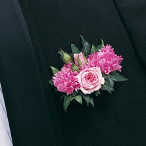 Another pocket look is created with light pink spray rose sided with hot pink spray carnations and dark green ivy leaf.