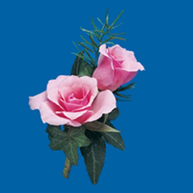 Two miniature spray roses (one just a bud) are paired with a sprig of sprengeri and ivy leaf.