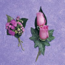 Pink sedum and pink roses are the choice of blooms in these two boutonnieres.