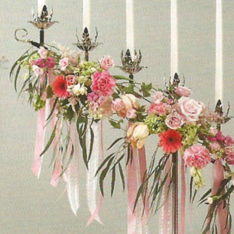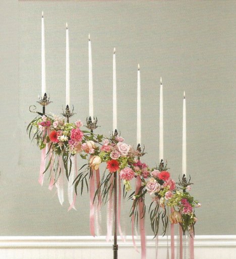 Attach the arrangements to the candelabra with the green chenille stems after delivery to the ceremony venue.