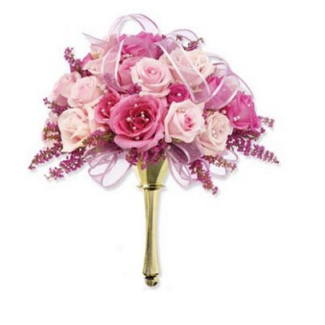 This pink round bouquet would also be lovely in lavender, yellow, green or blue. Roses come in a vast array of colors and the design can easily be changed to your prefered colors.