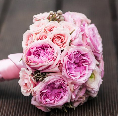 Pink wedding bouquets don't have to be all the same shade. This bouquet features a lovely combination of colors and textures. Pink ranunculus, miniature spray roses, carnations, astrantia, trachelium and white roses are in a massed hand tie finished with a hot pink wrapped handle.