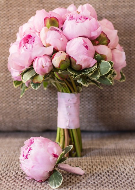 Tightly buds and half opened peonies are gathered together in a massed hand tie and accented with a collar of variegated pittosporum.