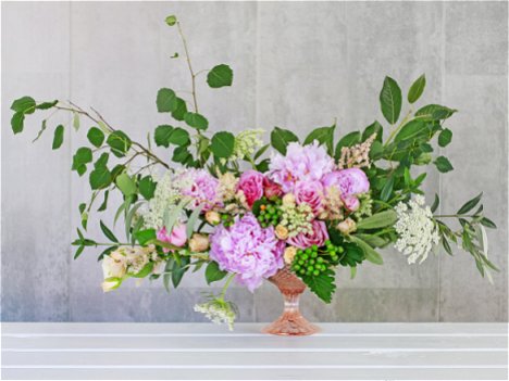 This pink wedding centerpiece is created in a loose, free style with long lines of greenery and flowers in an asymmetrical design. This simply means that the design does not fill in flowers in a perfect, shape.