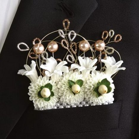 A new idea is the pocket boutonniere. Using floral adhesive to glue a line of fresh flowers, ribbons and filler across the top of a cardboard cut to the size of the breast pocket of a tux or suit. Decorate to suit you, then simply tuck the finished flowers into the pocket!