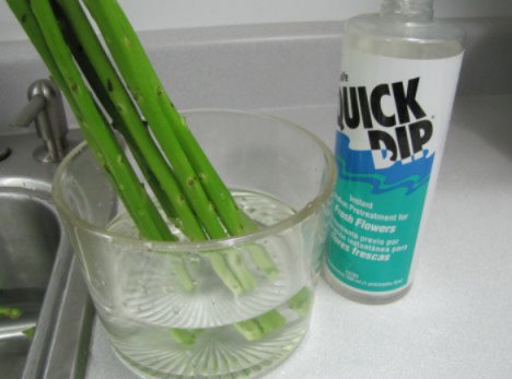 Quick Dip is a professional flower product that is designed to revive flowers and quickly draw water up the stem. It's pretty cheap and well worth investing in. It's the use of flower food (in the proper amount), the rehydrator and the flower sealant that sets professionals apart from amateurs. Professional florists know that these products are invaluable in keeping the flowers at their peak for as long as possible.