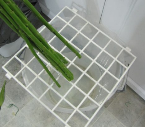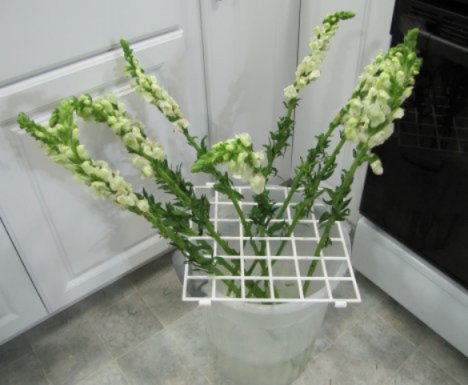 A grid is nice for keeping the taller flowers apart. Flowers that are pressed together can cause bacteria to grow and the blooms may rot in that area. Spreading the stems apart prevents that and lets every bloom open to it's full beauty. This grid is actually part of an old snap together shoe rack found at the local GoodWill. You can also use old cookie racks - basically anything that has holes and can lay across the top of a bucket.