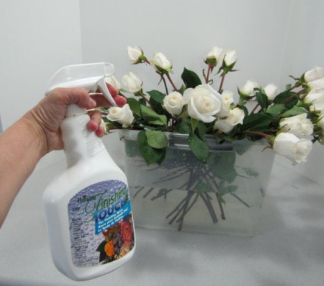 Florist coolers are design to put humidity INTO the cooler. Help stop the moisture loss by misting well with Finishing Touch and laying plastic wrap gently on the flower heads.