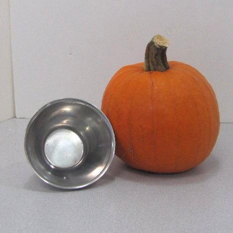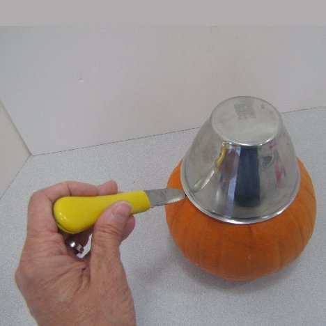 I have a small metal bowl, but a round plastic butter dish or other similar containers can work as well. Trace around the opening of the container on the top of the pumpkin, scoring lightly with your floral knife.