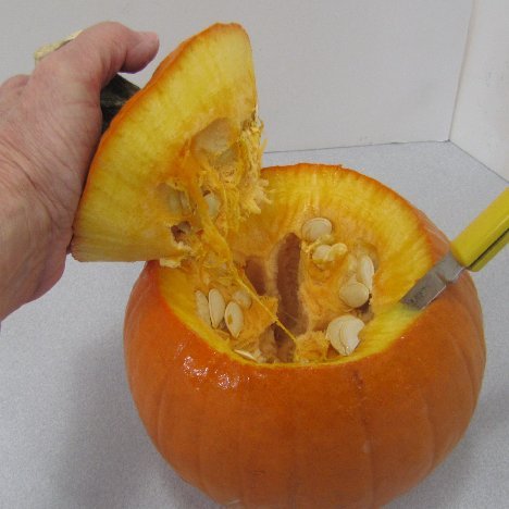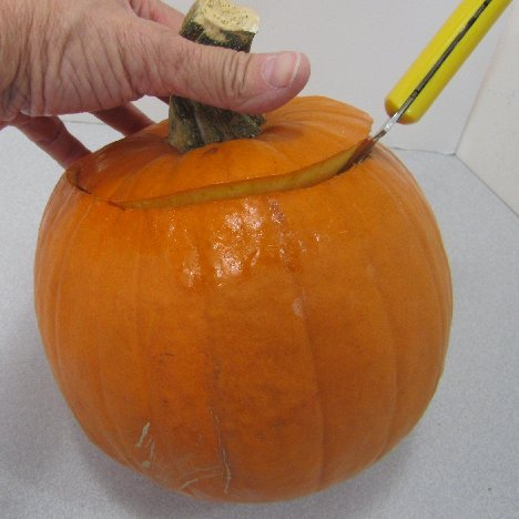 Use your knife to carefully cut the top portion off your pumpkin. Please take care - pumpkins are slippery and the knife can cut into your hand very easily!