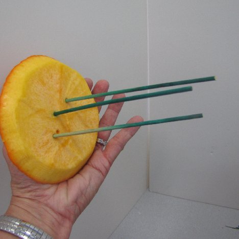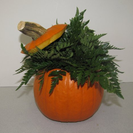 I want my pumpkin centerpieces to include to top that was cut out of the pumpkin. I want to use the cut out top as a design element in this fall pumpkin centerpiece. I use wooden Cowee stakes (often commonly referred to as hyacinth stakes) inserted into the underside of the pumpkin top.