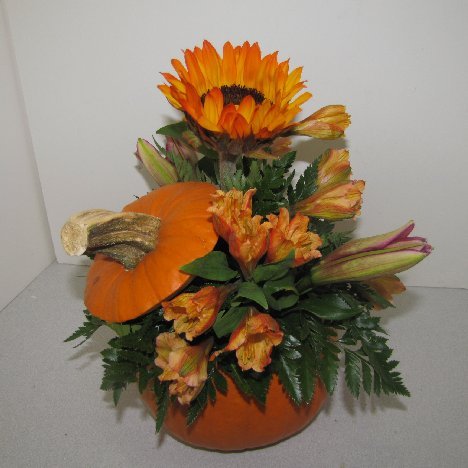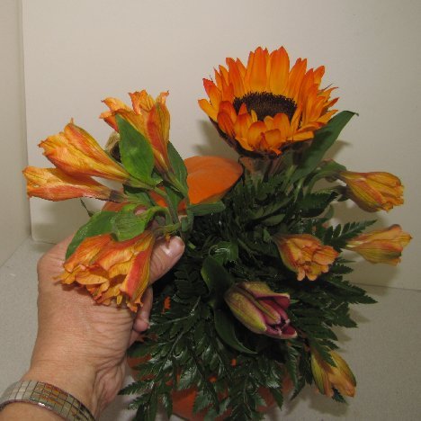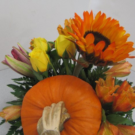 I'm tucking it right below the pumpkin's lid, on the other side of the sunflower (focal flower).