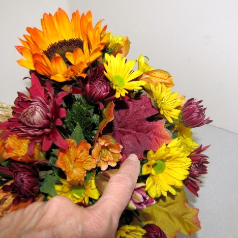 Tuck the leaves in at random, mixing or matching different colors with the flowers.