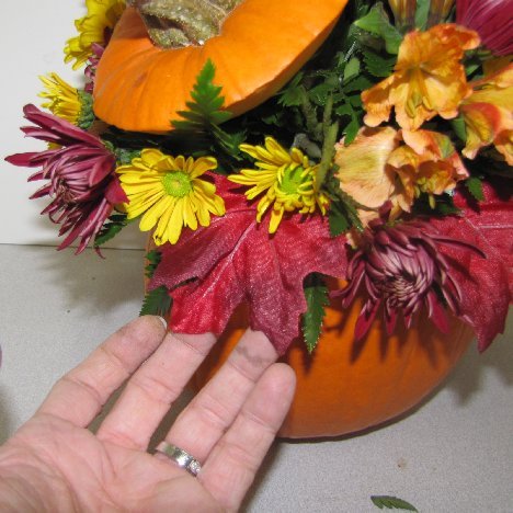 You can fill out your pumpkin centerpiece with fall leaves, berries, nuts, lotus pods, wheat and other interesting accents.  I found these lovely silk leave in a dollar store and couldn't resist giving one last splash of autumn color to this design.