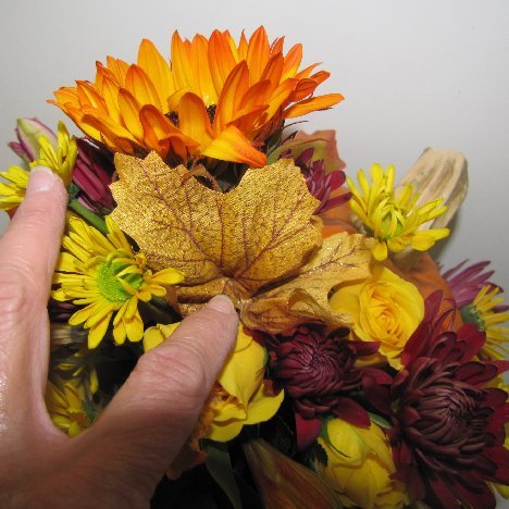 My fall pumpkin is getting pretty full, but I can't resist adding in a few more of these colorful silk leaves.