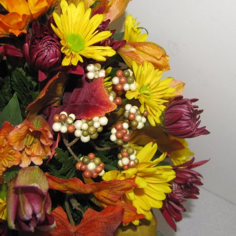 The overall design is very pleasing. Rotate it around, seeing if you need to add anything else. Fall arrangements always seem more clustered, allowing the rich autumn colors to blend rather than letting too much green from the foliage show.