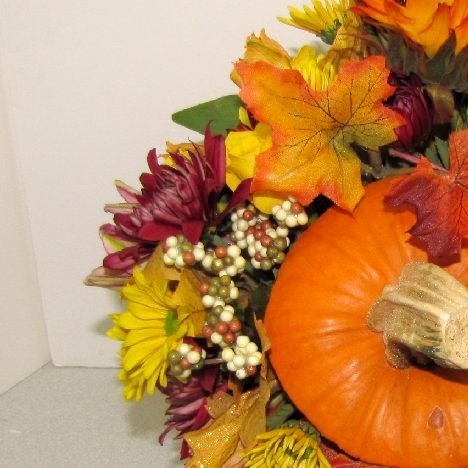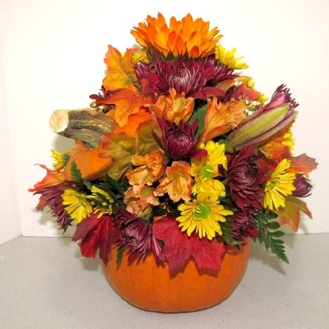 Finished! This fall centerpiece would be beautiful as wedding or shower arrangements for your tables. Keep in mind, however, that fresh pumpkins will not last as long as the flowers - you may have to transfer into another container after the pumpkin begins to get soft.
