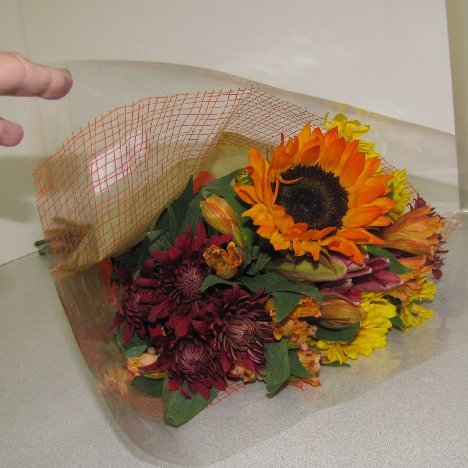 They are usually secured by either rubber bands or a wire twist of some kind. Remove carefully - you don't want to slit either the stems or the flower food packet that is enclosed at the bottom of the cellophane.
