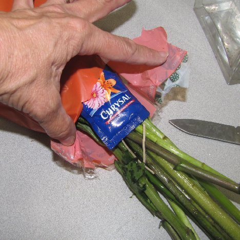 As you can see, a packet was dropped into the bottom of these flowers. Don't discard this packet, as you'll want to mix it with the water that you soaked your Oasis foam in.
