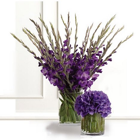 These purple wedding altar decorations are a striking bold color that will catch the eye of every guest. There is a tall flared vase of elegant gladiolus accompanied with a short vase of hydrangeas.